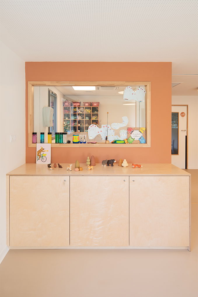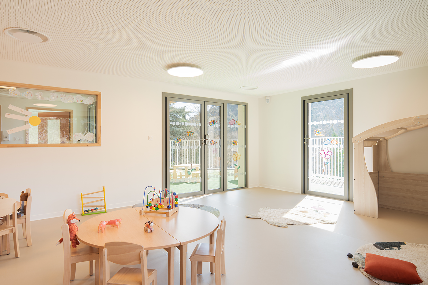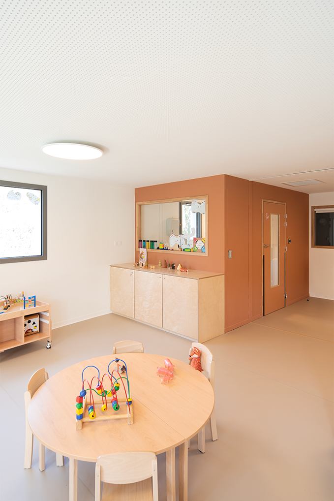 Le terrain naturel du projet toute en longueur et en pentes, plus précisément en « bancels », typique des Cévennes a nécessité un important travail de réflexion afin de permettre l’aménagement d’une crèche de 30 berceaux. Celle-ci, du fait des caractéristiques du terrain naturel, s’articule sur deux niveaux. La majorité des espaces destinés aux enfants étant aménagés au RDC. Une grande terrasse a été pensé dans le prolongement des salles de vie des enfants afin de proposer un aménagement de plein-pieds et permettant ainsi des vues très agréables sur l’extérieur. Le projet s’articule autour de deux sections (petits-moyens et moyens -grands) en RDC. La crèche est également dotée d’une salle de motricité au R+1.