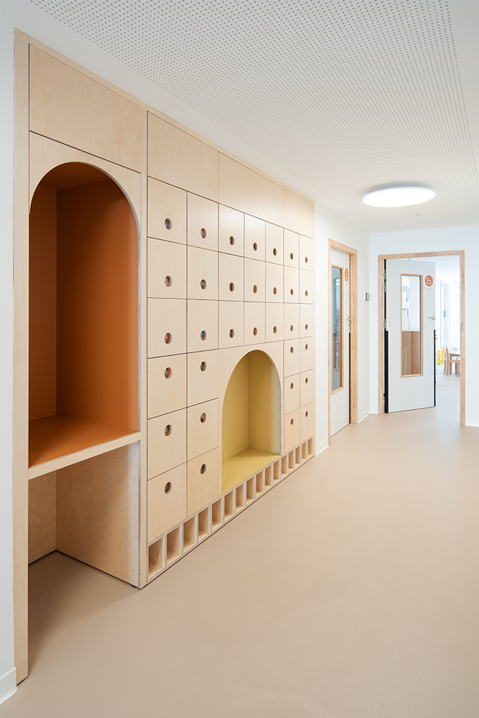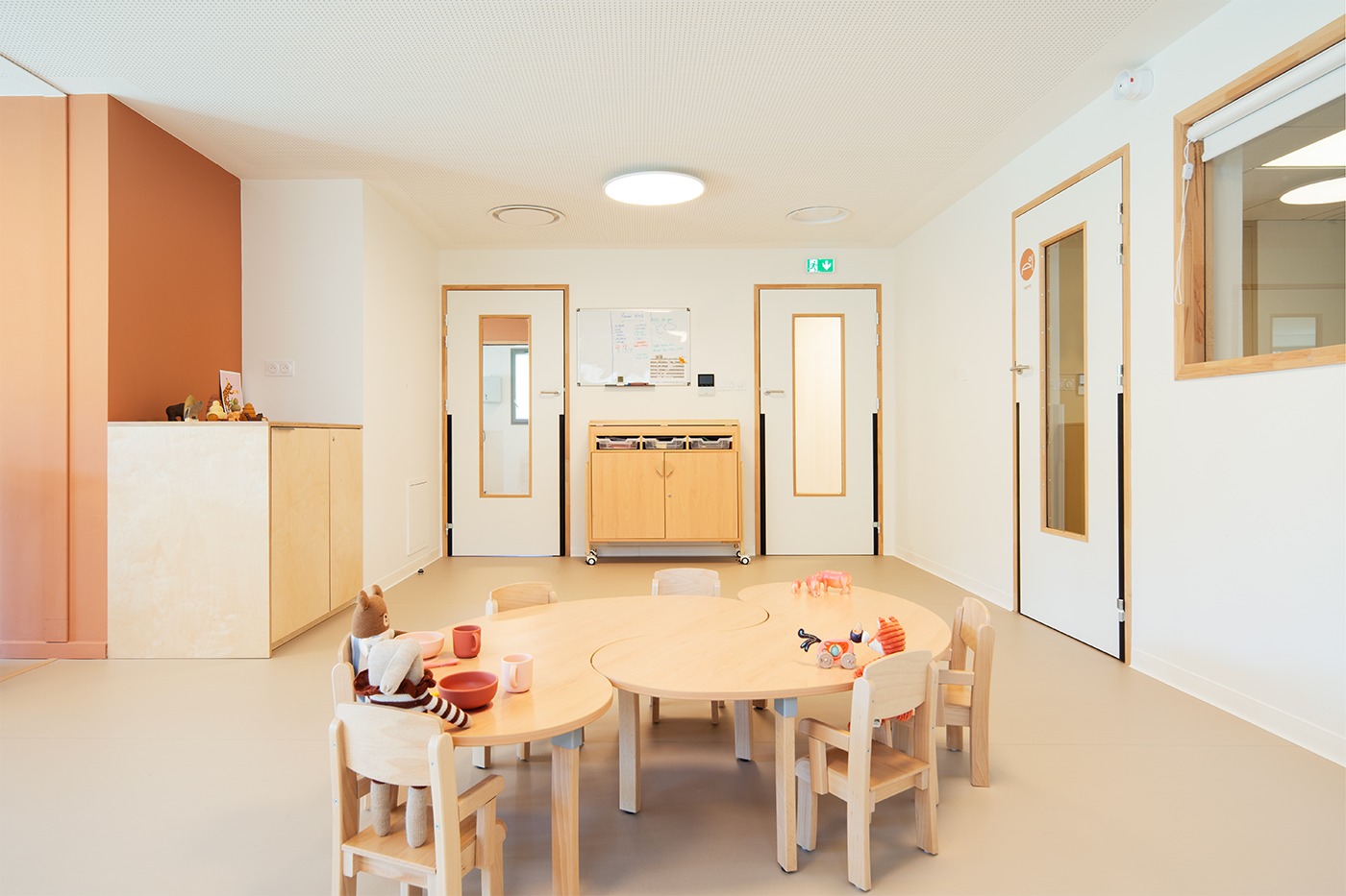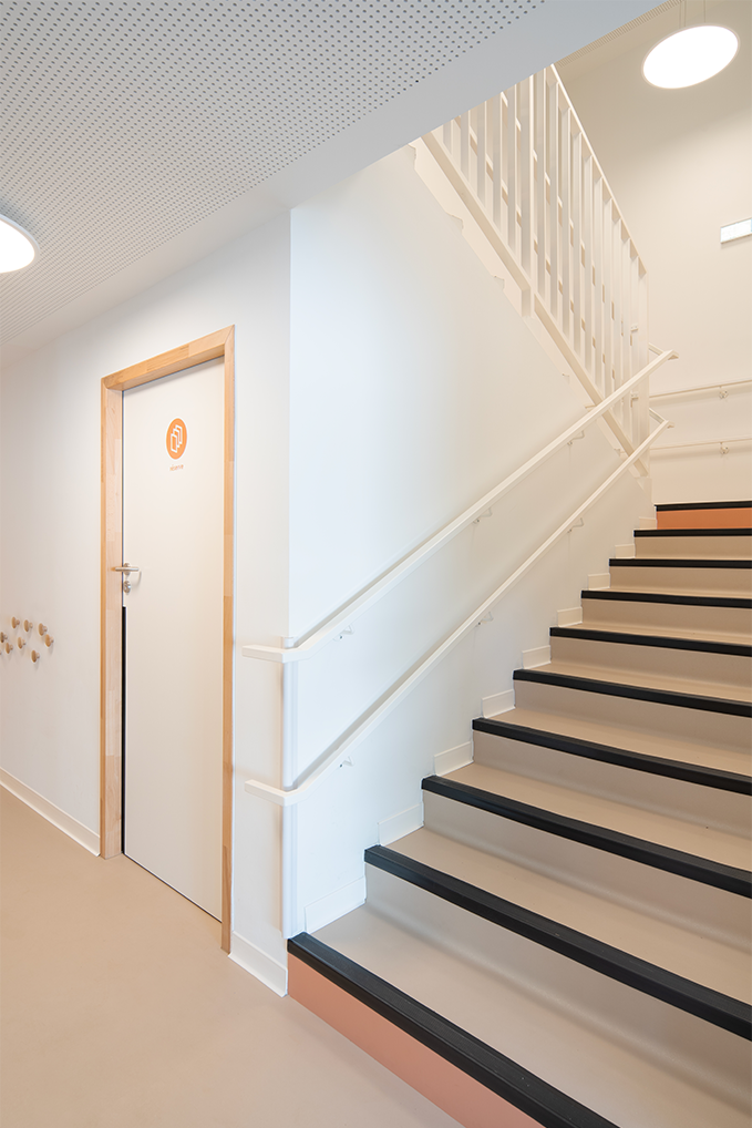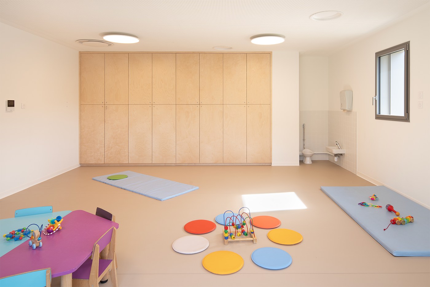 Le terrain naturel du projet toute en longueur et en pentes, plus précisément en « bancels », typique des Cévennes a nécessité un important travail de réflexion afin de permettre l’aménagement d’une crèche de 30 berceaux. Celle-ci, du fait des caractéristiques du terrain naturel, s’articule sur deux niveaux. La majorité des espaces destinés aux enfants étant aménagés au RDC. Une grande terrasse a été pensé dans le prolongement des salles de vie des enfants afin de proposer un aménagement de plein-pieds et permettant ainsi des vues très agréables sur l’extérieur. Le projet s’articule autour de deux sections (petits-moyens et moyens -grands) en RDC. La crèche est également dotée d’une salle de motricité au R+1.